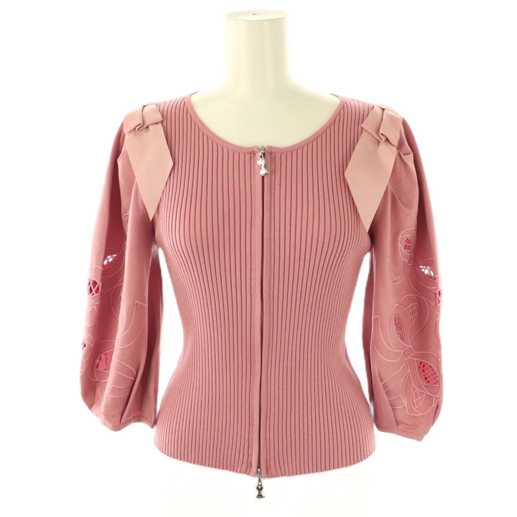 リボン柄入りジップアップニット
