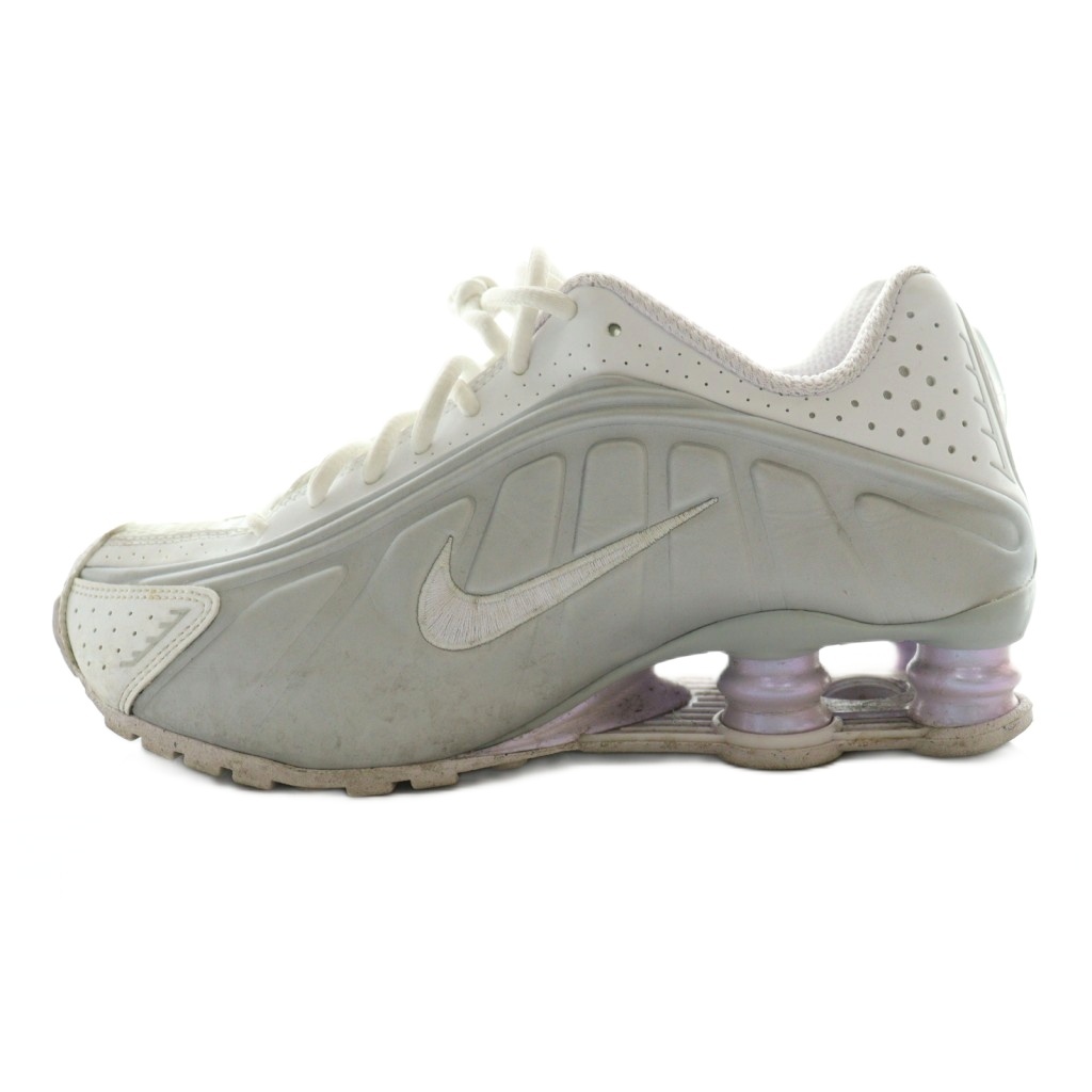 HF5076-100 Shox R4 White and Metallic Platinum スニーカー